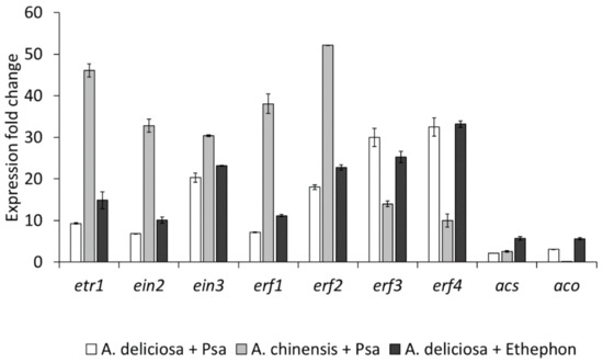 The induction of genes coding for ethylene receptors, signal transducers and transcription-activating factors was tested on A. chinensis and A. deliciosa plantlets inoculated with CFBP7286. Positive controls were represented by A. deliciosa plants exposed to 1 µL L−1 ethylene. Mock-inoculated plants were included for reference.