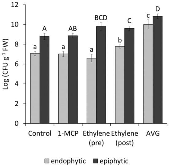 Effect of modulators of ethylene metabolim on bacterial colonisation. Endophytic and epiphytic populations of Pseudomonas syringae pv. actinidiae strain CFBP7286-GFPuv were measured in in vitro Actinidia deliciosa plants treated with 1-methylcyclopropene (1-MCP), ethylene (either pre- or post-inoculation) or aminoethoxyvinylglycyne (AVG). Values are presented as the average ± standard error (n = 4). Significant differences, determined by ANOVA and Fisher’s least significant difference test with p ≤ 0.05, are indicated by lower case (for endophytic populations) or upper case (for epiphytic populations) letters.
