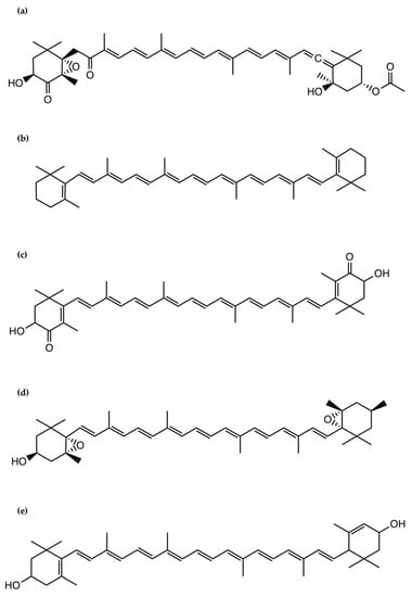 Fucoxanthin occurs abundantly in some macro- and microalgae and contributes to more than 10% of the estimated total production of carotenoids in nature. This pigment has been extensively investigated in microalgae for its role in photosynthesis. Fucoxanthin has been isolated and structurally identified from microalgae and can reach in a freeze-dried diatom a weight as high as 16.5 mg/g, which is 10 times higher than that in brown algae, suggesting potential applications in human and animal food, health and cosmetics []. Fucoxanthin is a xanthophyll, which contains an oxygen atom and thus is less chemically hydrophobic compared with the carotenes, which do not contain oxygen and are fat-soluble and insoluble in water (Figure 2). It includes a typical allenic bond, epoxide group, and conjugated carbonyl group in a polyene chain with antioxidant properties [].