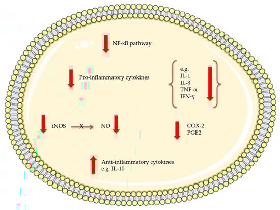 The effects of bioactive compounds extracted from microalgae involved in anti-inflammatory mechanisms. NF-kB stands for nuclear factor-kappa B, IL for interleukin, TNF for tumor necrosis factor, IFN for interferon, iNOS for inducible nitric oxide synthase, NO for nitric oxide, COX-2 for cyclo-oxygenase-2 and PGE2 for prostaglandin E2.