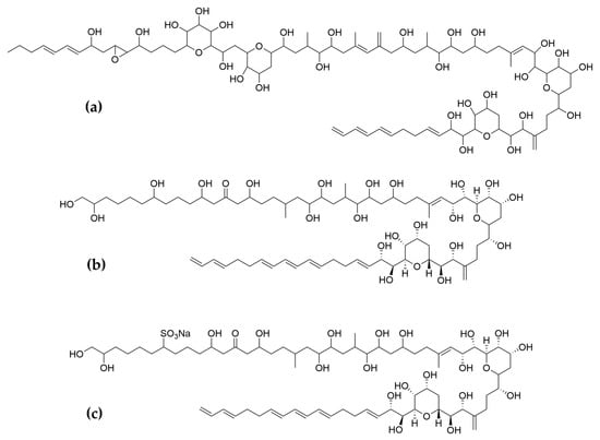 - Nagai, H.; Satake, M.; Yasumoto, T. Antimicrobial Activities of Polyether Compounds of Dinoflagellate Origins. J. Appl. Phycol. 1990, 2, 305–308. [Google Scholar] [CrossRef]