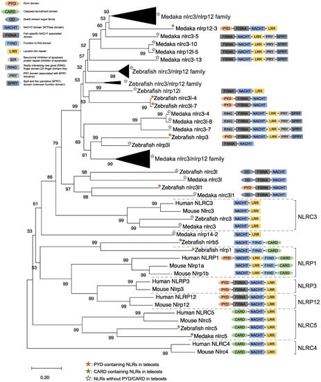 - Chang, M.X.; Xiong, F.; Wu, X.M.; Hu, Y.W. The expanding and function of NLRC3 or NLRC3-like in teleost fish: Recent advances and novel insights. Dev. Comp. Immunol. 2021, 114, 103859. [Google Scholar] [CrossRef]