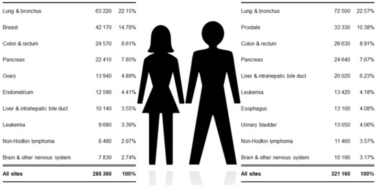 Cancer has become one of the most common human diseases and causes of death [1,2,3]. Among other factors, its occurrence is mainly growing because of aging [4]. Even though cancer is a disease that affects men as well as women, there seems to be a clear relationship between gender and incidence. Thus, lung, prostate, colorectal, stomach and liver cancer are predominant among men, while breast, colorectal, lung, cervical and thyroid are the most common cancers in women (https://www.who.int/health-topics/cancer, accessed on 29 March 2021). Figure 1 depicts the number of estimated deaths in 2020 by cancer type collected from the Surveillance, Epidemiology and End Results (SEER) database.