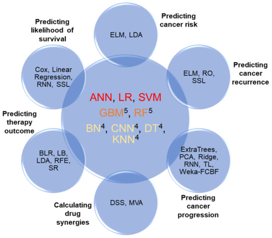 Once the cancer is diagnosed, one of the main concerns is the possibility of recurrence or metastasis. In this line, Exarchos et al. [71] used a data set comprising clinical, image and genomic data to provide a multiparametric system to detect recurrence in squamous cell carcinoma using BN, ANN, SVM, decision trees (DT) and RF classifier algorithms and ROC curve assessments. The best results in terms of accuracy were obtained for the BN classifier (78.6% accuracy for clinical data, 82.8% for images and 91.7% for genomic data). Kim et al. [134] studied the recurrence of BC over 5 years using SVMs, ANNs and regression analysis; in this case, the SVM model gave the best results in terms of accuracy (89%). In the same study, it should be noted that selection of the characteristics of the models was based on the mutual information provided by the input characteristics. In the same line of detecting recurrent BC, Park et al. [70] used genetic information to create a graphical model based on semi-supervised learning (SSL) through gene pairs that indicate strong biological interactions, in this case for both breast and colon cancer. This graphic model proved to be quite accurate in predicting the recurrence of breast and colon cancer (80.7% and 76.7%, respectively). This SSL technique was seen to very interesting when very few labelled samples are available, which is a fairly common problem for this type of data set.