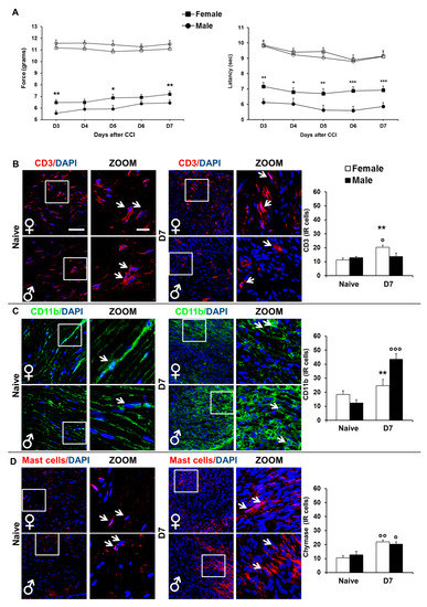 (A) left panel. Mechanical nociceptive threshold to neuropathic pain in female and male mice. Sex-related differences in the development of mechanical allodynia induced by CCI: time course of withdrawal thresholds (expressed as applied force in grams) of hind paws ipsi- and contralateral to the injury in female (ipsi ■, contra □) and male (ipsi ●, contra ○) mice. Numbers of mice for the two different experimental groups were: n = 20 (male), and n = 20 (female). (*) p < 0.05, (**) p < 0.01 between male and female mice. (A) right panel. Thermal hyperalgesia threshold to neuropathic pain in female and male mice. Time course of thermal hyperalgesia (expressed as latency in seconds) of hind paws ipsi- and contralateral to the injury in female (ipsi ■, contra □) and male (ipsi ●, contra ○) mice. Numbers of mice for the two different experimental groups were: n = 20 (male), and n = 20 (female). (*) p < 0.05, (**) p < 0.01, (***) p < 0.001 between male and female mice. (B–D) Sex differences in the expression of several immune positive cells in sciatic nerve. Representative examples of high magnification (63×) IF images of several immune positive cells and nuclei (DAPI, blue), taken from sciatic nerves of no CCI (naïve, left panels) and CCI D7 (D7, right panels) male and female mice, respectively. Square indicates the area considered for acquisition of the representative examples of high magnification (63× with 3× zoom) IF images reported in other panels (scale bar: 50 μm). (B) CD3 (limphocytes T positive cells, red). Histograms show the quantification of the total number of immune positive cells in male and female no CCI and CCI (D7) mice. (**) p < 0.01, between male and female mice; (°) p < 0.05, vs. the corresponding naïve group. (C) CD11b (macrophages positive cells, green). Histograms show the quantification of the total number of CD11b positive cells in male and female no CCI and CCI (D7) mice. (**) p < 0.01, between male and female mice; (°°°) p <0.001, vs. the corresponding naïve group. (D) Mast cell chymase (Mast positive cells, red). Histograms show the quantification of the total number of mast cell chymase positive cells in male and female no CCI and CCI (D7) mice. Histograms show the quantification of the total number of CD11b positive cells in male and female no CCI and CCI (D7) mice. (°) p < 0.05, (°°) p < 0.01, vs. the corresponding naïve group.