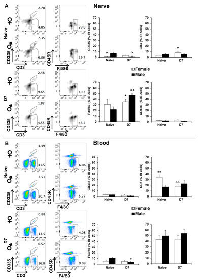 Flow cytometry. Panels show representative examples FACs plots. The following anti mouse antibodies were used: CD45 APC-eFluor-780 conjugated to select hematopoietic lineage cells; CD335 PE-eFluor 610 conjugated characteristic of Natural Killer cells; CD3 PE conjugated to identified T lymphocytes; CD45R VioBlue conjugated to identified B lymphocytes; F4/80 PE Vio770 conjugated and MHC-II Fitc conjugated to select monocyte population. Histograms show the percentages of several immune cells present in serum and sciatic nerve of male (dashed black bars) and female (dashed white bars) mice at both time points: naïve and D7 post CCI. (A) Panels show the percentages of several immune cells present in serum and sciatic nerve of male and female mice in naïve condition. Histograms show the percentages of several immune cells present in serum. (*) p < 0.05 between male and female mice; (°) p < 0.05; (°°) p < 0.01, vs. the corresponding naïve group. (B) Panels show the percentages of several immune cells present in blood and sciatic nerve of male and female seven days post CCI. Histograms show the percentages of several immune cells present in sciatic nerve. (**) p between male and female mice; (°) p < 0.05, (°°) p < 0.01, vs. the corresponding naïve group.