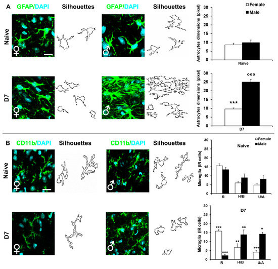 Sex differences in the expression/activation of spinal glial cells. Left panels show representative examples of high magnification (63× with 3× zoom) IF images showing the expression of: (A) GFAP (astrocytes) in L4/L5 spinal cord sections taken from no CCI (naïve) and CCI D7 (D7) male and female mice (scale bar: 50 μm). Each image has been transformed to a digital image where outline of cell silhouettes was identified and automatically measured for astrocytes by using RGB method that converted pixel in brightness values. Histograms show the quantification of astrocytes dimension in male (dashed black bars) and female (dashed white bars) and no CCI (naïve) and CCI (D7) mice. (***) p < 0.001 between male and female; (°°°) p < 0.001 vs. the corresponding naïve group. (B) CD11b (microglia) in L4/L5 spinal cord sections taken from no CCI (naïve) and CCI D7 (D7) male and female mice (scale bar: 50 μm). Each image has been transformed in digital image where outline of cell silhouettes was identified and singularly counted and divided about the different morphology: (Resting/Ramified (R), Hyperactive/Bushy (H/B), Unramified/Ameboid (U/A). Histograms show the quantification of the different morphology of CD11b positive cells in male (dashed black bars) and female (dashed white bars) no CCI (naïve) and CCI (D7) mice. (**) p < 0.01, (***) p < 0.001, between male and female; (°) p < 0.05, (°°) p < 0.01, (°°°) p < 0.001 vs. the corresponding naïve group.