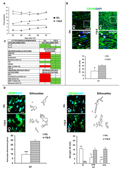 Behavioral results have also been associated with IF analysis of specific markers at the spinal cord level. To analyze the role of 17β-estradiol in the expression (activation and morphology) of glial cells, we performed IF staining of astrocytes (GFAP) and microglia (CD11b) 7 days after CCI (D7). We observed a significant increase of reactive and hyperactive astrocytes in 17β-E female mice compared to OIL females (p = 0.0017; Figure 4D) and a significant increase in 17β-E female mice of (H/B) and (U/A) microglia in comparison to OIL group (p = 0.0006, p < 0.0001, respectively; Figure 4D). On the other hand, we observed a significant decrease of (R) resting, non-active microglia (p < 0.0001; Figure 4D) in 17β-E females compared to OIL female group. These data support the key neuromodulatory role of 17β-estradiol in NeP.