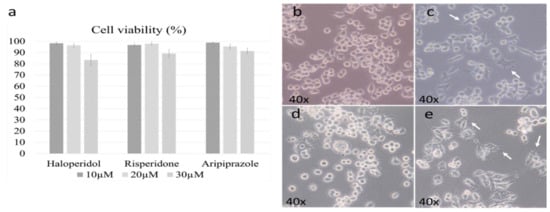 Cell viability and morphology after antipsychotic administration. Three different doses of antipsychotics were examined during the cell viability assay (10 µM, 20 µM, 30 µM). The dose of 20 µM was the highest one with satisfactory cell viability for all three antipsychotics (a). The morphology of control BV-2 microglial cells was mostly ameboid (b), with slight changes towards a more ramified state when treated with risperidone (c) and aripiprazole (e); representative cells are marked with white arrows. Cells treated with haloperidol retained a predominant ameboid morphology (d).