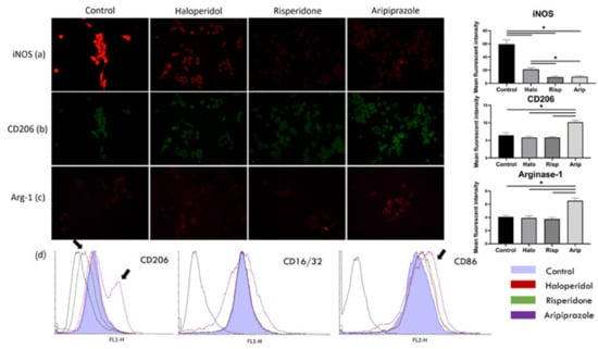 The results of the immunofluorescence point to a significant reduction in iNOS mean fluorescent intensity after treatment with all three antipsychotics (F3, 36 = 380.0, p = 0.0015), with the highest statistically significant reduction in risperidone (p < 0.0001) and aripiprazole (p < 0.0001) treated cells (Figure 2a). The mean fluorescent intensity of CD206 and Arg-1 significantly increased after aripiprazole administration (p < 0.0001) compared to the control, haloperidol and risperidone samples (Figure 2b,c). On the other hand, there was no increase in the expression of mentioned markers in haloperidol (p = 0.622) and risperidone (p = 0.1205) samples compared to the control. Therefore, the BV-2 phenotype after treatment with haloperidol and risperidone was iNOSlow, CD206low Arg-1low, while it was iNOSlow, CD206high Arg-1high in cells treated with aripiprazole (Figure 2a–c). All cells analyzed in flow cytometry had a predominant pro-inflammatory phenotype, with high CD86 and CD16/32 expression (Figure 2d). However, there was a significant number of cells with a higher CD206 and CD86 surface expression in aripiprazole-treated cells, while the risperidone-treated cells exhibited lower CD206 surface expression (Figure 2d). These results indicate that aripiprazole-treated cells display a distinct phenotype in both immunofluorescence and flow cytometry analysis towards a more anti-inflammatory phenotype, compared to the control, haloperidol and risperidone-treated cells (Figure 2).