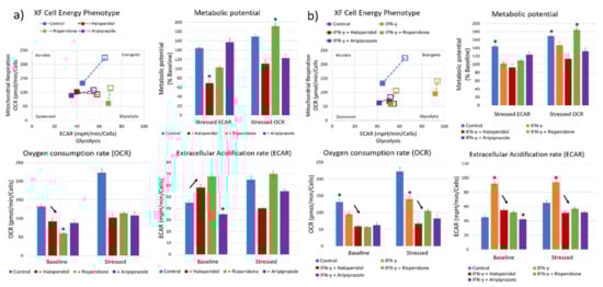Current research indicates that the energy demands of the brain in schizophrenia are increased, to the point that cells often shift to glycolytic pathways to meet energy demands []. The metabolic effect of antipsychotic treatment is a common topic of discussion and the cause of numerous side-effects, especially in second-generation antipsychotics such as risperidone or olanzapine []. There is a lack of studies covering the effects of antipsychotics of metabolic properties on microglial cells. Thus, we have performed a real-time metabolic assay of microglial cells treated with the three tested antipsychotics to assess their direct effect in modulating metabolic activities in the cells. All three antipsychotics lowered the aerobic metabolic rate; however, there were significant differences in the anaerobic metabolism. Haloperidol and risperidone increased the glycolytic activity of cells, in contrast to aripiprazole, which reduced it compared to control cells. Importantly, all antipsychotics were successful in ameliorating increased glycolytic metabolic activity in IFN-γ stimulated cells.
