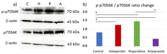 Effect of antipsychotics on the mTORC1 signaling pathway. Expression of the mTORC1 signaling pathway was assessed using Western blot. There were significant differences in p70S6K activity between control cells and those treated with antipsychotics (F3, 12 = 1.840, p < 0.0001). Control BV-2 microglial cells exhibited moderate activity of p70S6K (a,b), a downstream protein in the mTORC1 signaling pathway. Haloperidol (p < 0.0001) and risperidone (p < 0.0001) increased the expression of phosphorylated p70S6K (p-p70S6K), indicating mTORC1 activity. On the other hand, aripiprazole (p < 0.0001) significantly reduced the p-p70S6K/p70S6K ratio, indicating diminished mTORC1 activity compared to the control cells (b). * Statistical significance was set at p ≤ 0.05 values.