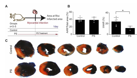 To evaluate the cardioprotective effects of phosphatidylserine treatment, a model of acute myocardial ischemia-reperfusion injury was used (Figure 1A). To omit possible long-time effects of inflammation and remodeling, the area at risk (AAR) and infarcted area were analyzed at 24 h after AMI induction. Phosphatidylserine treatment was able to increase the survival of cardiomyocytes exposed to ischemia in infarcted area (11.72 ± 3.63% from AAR in treated group vs. 23.75 ± 7.49% from AAR in control, p = 0.0437), as showed by Evans-blue and tetrazolium staining (Figure 1B,C). Area at risk was similar in both treated and untreated group (38.69 ± 7.42% in treated mice vs. 39.04 ± 6.00% in control group).