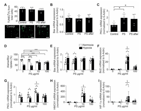 To further evaluate the effect of phosphatidylserine on cardio-protection, we isolated murine neonatal cardiomyocytes and treated them with phosphatidylserine during normal or hypoxic culture conditions. Interestingly, phosphatidylserine treatment of neonatal cardiomyocytes improved cell viability in a dose-dependent manner (Figure 2D). AlamarBlue® uptake, as a measure of cell viability was improved with higher dosis, but not at lower dosis of phosphatidylserine in medium. Similarly, treatment with phosphatidylserine did not change mRNA expression of the pro-apoptotic protein, Bax (Figure 2E) and increased mRNA expression of the anti-apoptotic protein, Bcl2 (Figure 2F) in a dose-dependent manner (22.89 ± 7.63 relative expression after 10 µg PS treatment vs. 1.37 ± 0.78 relative expression in control group in normoxic condition, 32.51 ± 8.29 relative expression in after 10 μg PS treatment vs. 1.56 ± 0.94 relative expression in control group in hypoxic condition, p = 0.0012). We have found that phosphatidylserine-treatment resulted in a dose-dependent upregulation of cardioprotective mediators, such as PKC-ε (1.49 ± 0.22 relative expression after 10 µg PS treatment vs. 0.88 ± 0.22 relative expression in control group in normoxic conditions, 1.13 ± 0.12 relative expression in after 10 µg PS treatment vs. 0.69 ± 0.26 relative expression in control in hypoxic conditions, p = 0.0143, Figure 2G), heme oxygenase (HMOX)-1 (321.86 ± 117.41 relative expression after 10 µg PS treatment vs. 6.98 ± 10.07 relative expression in control group in normoxic conditions, 333.41 ± 82.73 relative expression in after 10 µg PS treatment vs. 18.50 ± 13.86 relative expression in control in hypoxic conditions, p < 0.0001, Figure 2H) and hypoxia inducible factor (HIF)-1α (22.80 ± 14.51 relative expression after 10 µg PS treatment vs. 1.65 ± 1.27 relative expression in control group in normoxic conditions, 55.56 ± 45.56 relative expression in after 10 µg PS treatment vs. 1.75 ± 0.90 relative expression in control in hypoxic conditions, p = 0.0097, Figure 2I), when compared to control. Interestingly, it seems that treatment of the cells with 100 µg phosphatidylserine induced a decrease in all protective genes, which can be in part of due to a mild cytotoxic effect of phosphatidylserine.