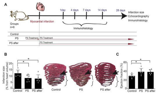 Phosphatidylserine supplementation reduced infarct size and prevented adverse post-infarct LV remodeling. (A) Study design: mice were randomly assigned to 3 treatment groups: (1) Control (n = 6): saline vehicle control by daily oral gavage one week prior to and for four weeks post-AMI; (2) phosphatidylserine group (PS, n = 6): phosphatidylserine was given by daily oral gavage for both one week prior and four weeks following AMI; and (3) phosphatidylserine after (PS after, n = 6): phosphatidylserine was given by daily oral gavage for four weeks post-AMI. Samples were collected and analyzed at the indicated time points, and infarction size and cardiac function were evaluated after 28 days. (B) Infarction size was significantly decreased in mice treated with phosphatidylserine when compared to control (n = 6, One-way ANOVA, Newman–Keuls’s multiple comparison Test, * p < 0.05 vs. control, Values ± SD). 3D volume reconstruction of infarcted hearts up to the mitral level from each group are shown as representative example for measuring infarction size. Arrows point out the ligature place in each heart. (C) Ejection fraction (%) was significantly preserved in mice treated mice with phosphatidylserine when compared to control (n = 6, One-way ANOVA, Newman–Keuls’s multiple comparison Test, * p < 0.05 vs. control, Values ± SD).
