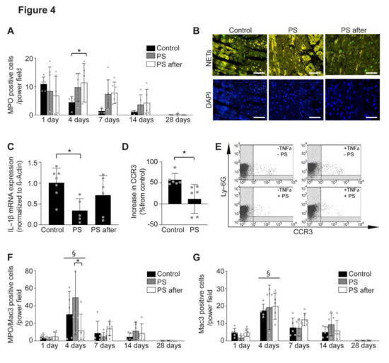 As possible mechanisms of improved healing and remodeling after AMI, we have analyzed the effect of phosphatidylserine on the inflammation [11]. Unexpectedly, the number of neutrophils was significantly increased at day 4 (8.45 ± 8.46 cell/power field), and 7 (7.37 ± 8.46 cells/power field) post-AMI in the infarction area of mice treated with phosphatidylserine pre- and post-AMI, as well as in the group that received phosphatidylserine only after AMI (11.37 ± 6.74 neutrophils/power field at day 4 and 7.81 ± 3.80 neutrophils/power field at day 7), when compared to control (4.52 ± 2.04 neutrophils/power field at day 4 and 1.41 ± 0.92 cells/power field at day 7, p < 0.05, Figure 4A). However, we found decreased histone H3cit staining, used to assess formation of neutrophils extracellular traps (NETs), in the group treated with phosphatidylserine pre- and post-AMI, but not in the group that received phosphatidylserine only after AMI (Figure 4B). Further, mRNA expression of IL-1ß, a known neutrophil activation marker, was significantly decreased after phosphatidylserine treatment pre- and post-AMI (0.34 ± 0.28 relative expression, p = 0.0225 vs. control), but not in the group that received phosphatidylserine only after AMI (0.71 ± 0.46 relative expression), when compared to those of control group (1.00 ± 0.35 relative expression, Figure 4C), which can in part explain the differences in echocardiographic measurements between the groups. Thus, despite increased neutrophils recruitment, their activation seems to be impaired by phosphatidylserine treatment. To demonstrate this fact, we have isolated neutrophils from bone marrow of mice and activated them using tumor necrosis factor (TNF)-α, to mimic the post-infarction conditions. Phosphatidylserine treatment inhibited TNF-α induced activation of isolated neutrophils by reducing the expression of the activation marker CCR3 [33,34,35,36] (11.68 ± 34.50% vs. 57.32 ± 14.87% increase in CCR3 relative expression compared with control, p = 0.0139, Figure 4D,E).