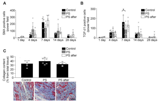 The effect of phosphatidylserine on remodeling after AMI. (A) The number of myofibroblasts (α-SMA positive cells) in the infarct area increased following permanent coronary ligation with no difference between the control or PS treated groups (n = 5–6/group, Two-way ANOVA, Bonferroni’s multiple comparison Test, Values ± SD). (B) TGF-β1 expression is less pronounced after phosphatidylserine treatment (n = 5–6/group, Two-way ANOVA, Bonferroni’s multiple comparison Test, * p < 0.05 vs. Control, Values ± SD). (C) There was no difference in myocardial collagen content (blue, Gomori staining) expressed as % from infarcted area at 28 days after AMI between control (Control) and phosphatidylserine-treated mice (PS, PS after) (n = 5–6/group, One-way ANOVA, Turkey’s multiple comparison Test, Values ± SD). Representative images of Gomori staining (lower panel, scale bar 50 µm).