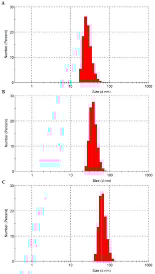 Dynamic light scattering size distribution of the different PS-NPs in phosphate-buffered saline, pH 7.4. Graphs, (A)—29 nm, (B)—44 nm and (C)—72 nm, were prepared by means of the Zetasizer Nano-ZS software.