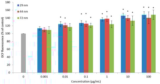 ROS level in PBMCs incubated with PS-NPs of diameter 29, 44 and 72 nm in the concentration range of 0.001 to 100 µg/mL for 24 h (n = 5). * p < 0.05 indicates statistically significant difference from control; one-way ANOVA and a posteriori Tukey test.