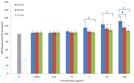 Changes in hydroxyl radical levels of cells incubated with PS-NPs of diameter 29, 44 and 72 nm in the concentration range of 0.001 to 100 µg/mL for 24 h (n = 5). * p < 0.05 indicates statistically significant difference from control; (•) statistically significant difference between nanoparticles of size 29 versus 44 nm; (#) statistically significant difference between nanoparticles of size 29 versus 72 nm. One-way ANOVA and a posteriori Tukey test.