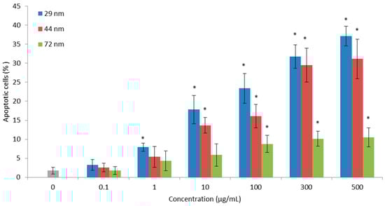 Percentage of apoptotic PBMCs incubated for 24 h with PS-NPs of diameter 29, 44 and 72 nm in the concentration range from 0.01 to 500 µg/mL (n = 5). * p < 0.05 indicates statistically significant difference from control; one-way ANOVA and a posteriori Tukey test.