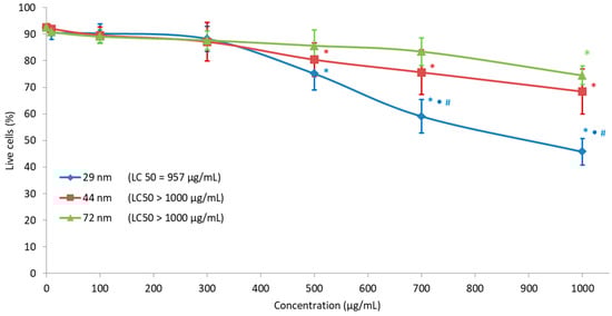Percentage of cell viability incubated with PS-NPs with a diameter of 29, 44 and 72 nm in the concentration range of 10 to 1000 µg/mL for 24 h (n = 5). * p < 0.05 indicates statistically significant difference from control; (•) statistically significant difference between nanoparticles of the size 29 versus 44 nm; (#) statistically significant difference between nanoparticles of the size 29 versus 72 nm. One-way ANOVA and a posteriori Tukey test.