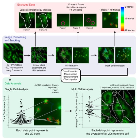 To examine LD motility dynamics in the context of the activation of early innate immune pathways, we first developed a pipeline to image and track LDs in live primary immortalised astrocyte cells. Astrocytes were chosen as a model cell type, because they are known to alter LD numbers following viral stimulation and infection, and have a high number of basal LDs []. Additionally, astrocytes are known to be rapid producers of an effective antiviral response []. Astrocytes cultured in 35 mm glass bottom dishes were labelled with Bodipy (493/503) to stain for LDs. A total of 49 time-lapse images over six fields of view (FoV) were captured using fluorescence microscopy (500 ms exposure, images captured every 5 s) (Figure 1). Images were imported into FIJI analysis software and registered using the linear stack alignment with SIFT (scale invariant feature transform) plugin []. Regions of interest (ROIs) were manually drawn around individual cells in each of the six FoVs before LDs within each ROI were tracked using TrackMate software on FIJI []. Mean speed, displacement and track quality were extracted for further processing (Figure 1). All captured data was initially screened to exclude cells that had undergone large morphology changes (i.e., dying cells), when LDs were detected but were discontinuous (i.e., >1 µm movement between frames, spots missing in sequential frames) and to exclude LD tracks that lasted less than 10 sequential frames. The exclusion of this data ensured that false positive tracks were not included in downstream data analysis (Figure 1). Individual LD tracks could be analysed or further processed to produce average displacement and speed values for each individual cell, allowing for multi-cell analysis. This was performed to generate a general picture of the LD dynamics within cells, and to remove the potentially confounding nature of extreme outliers (Figure 1).