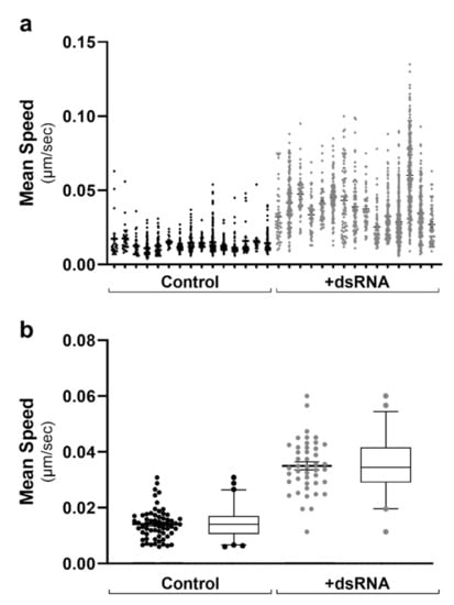 Lipid droplet tracks graphed as multi-cell analysis for downstream comparisons. Following the live image acquisition of LD motility, the mean speed of LD tracks were graphed as (a) single-cell analysis of individual tracks within each cell (n = > 20,000 tracks). Data is represented as a scatter plot with individual points. As there were n > 40 individual cells within each condition, data was condensed as (b) multi-cell analysis with all tracks within an individual cell averaged to a single data point. Data is represented as both scatter plots and box and whisker plots showing the mean, with 25–75 percentile range as the box and 5–95 percentiles as the whiskers. Control: n = 60 RNA: n = 41 cells.