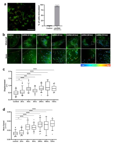 It is well-established that viruses can usurp host lipids to fuel their replication [,,]; therefore, we first investigated LD dynamics following stimulation of astrocyte cells with the synthetic dsRNA viral mimic, poly I:C, known to mimic viral RNA pathogen-associated molecular patterns (PAMPs), and activate the RNA sensors RIG-I and TLR-3 to drive an immune response (reviewed in []). In order to decipher the change in LD dynamics in astrocytes, we first optimised the delivery of a fluorescently labelled poly I:C (dsRNA viral mimic) into cells, to achieve at least a 95% uptake of the RNA (Figure 3a). Following stimulation with the dsRNA viral mimic, live-stained LDs within astrocyte cells were tracked over a time course from 2 h post-infection up to 72 h, and the average displacement and speed of LDs was analysed (Figure 3b–d). We observed four main diffusion types of LDs: tight restricted, restricted, directed, and random (Figure S1 and Video S1). As early as 4 h post-dsRNA stimulation, LDs were consistently more motile (Figure 3b–d) and were observed to frequently travel in a directed manner, changing paths multiple times (Figure 3b). There was a small, but significant increase in the displacement of LDs at 2 h post-stimulation; however, this was not associated with an increase in speed (Figure 3c,d). LD displacement was significantly increased at all timepoints, with the peak of displacement occurring at 48 h post-stimulation, with an average displacement of 0.85 μm, and some individual cell averages reaching up to 1.41 μm within this timepoint data set (Figure 3c). The average speed of LDs following viral mimic stimulation was increased across all timepoints with the exception of the 2 h timepoint. The average speed of LDs peaked at 24 h post-stimulation, with an average speed of 0.034 μm/sec (Figure 3d); and this was maintained throughout the time course. However, at 8 h post-dsRNA stimulation, there was a significant dip in the average displacement and speed of LDs (Figure 3c,d). The detection of dsRNA by sentinel innate immune receptors initiates a signalling cascade that results in the rapid production of interferon, and it is possible that the dip in LD speed and displacement following 8 h is lifted via the production of interferon (IFN).