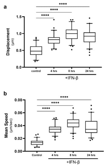 Following activation of immune receptors by foreign dsRNA, the cell upregulates an antiviral response culminating in the production of antiviral cytokines; most notably type I IFN, IFN-α/β []. IFNs are then secreted by the infected cell, to activate a secondary immune pathway in neighbouring cells, priming them before infection (reviewed in []). We have previously demonstrated that IFN responses can be altered when LD dynamics are changed [], and we therefore wanted to assess if IFN stimulation would impact LD motility in vitro. Astrocytes in culture were stimulated with the type-I IFN, IFN-β, and LD dynamics were tracked (Figure 4). Average LD displacement and speed were significantly increased from the control at all timepoints following stimulation and peaked at 8 h post-stimulation (Figure 4a,b). The average LD displacement and speed within cells reached levels greater than those seen following dsRNA treatment, peaking at 0.99 μm and 0.044 μm/s.