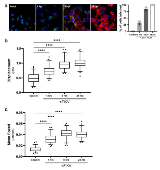It is clear that LD dynamics change following synthetic activation of the innate immune pathways; however, to determine whether this also occurred in the context of a true viral infection, we infected astrocyte cells with an RNA virus, Zika virus (ZIKV), and monitored LD dynamics over three timepoints (Figure 5). Following live LD tracking, cells were fixed and stained for viral RNA. A spreading viral infection was observed, with an average cell infection rate of 32% at the initial timepoint, with all cells displaying viral RNA by 24 h (Figure 5a). When assessing the LD dynamics of these cells, a similar trend was observed where there was an increased average displacement and speed of LDs post-ZIKV infection (Figure 5b,c). LD displacement following ZIKV infection peaked at 24 h, with an average of 1.01 μm distance travelled by LDs, with some LDs averaging a displacement of 1.46 μm (Figure 5b). In contrast, the average speed of the LDs peaked at 8 h post-infection, with LDs travelling at 0.044 μm/s on average; however, the fastest LDs were seen at the 24 h timepoint and reached 0.064 μm/s, with the average of this timepoint being lower at 0.041 μm/s (Figure 5c).