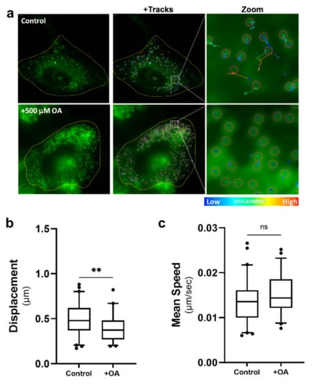 It has been well described by us and others that pathogen infection of cells can drive an increase in the number of LDs in a cell []. To assess if simply increasing the number of LDs per cell could drive a change in LD dynamics, astrocytes were treated with oleic acid (OA), a long-chain fatty acid (C18:1) that has been demonstrated to stimulate the biogenesis of LDs in different cell types including astrocytes []. Cells were treated with 500 µM of OA in media 16 h prior to being imaged and LD dynamics tracked. OA drove a large increase in the number of LDs in the astrocytes (Figure 6a); however, we saw only a small but significant decrease in the distance travelled by these LDs in comparison to the vehicle-only treated cells (Figure 6b), with a lot more LDs within the OA-treated group being tightly restricted (Figure 6a). Interestingly, although we saw an average decrease in displacement of LDs in the OA-treated cells, there was no significant change in the speed of these LDs (Figure 6c). This data suggests that the number of LDs alone has little impact on the changing LD dynamics we observe following infection.