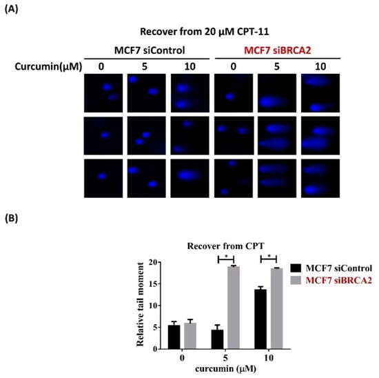 Curcumin reduced HR to sensitize BRCA2-deficient cells to chemotherapy. Curcumin inhibited DNA repair following CPT-11 treatment in MCF7-siBRCA2 cells. (A) The cells were treated with CPT-11 to induce DSBs for 1 h; then, CPT-11 was washed out, and the cells were allowed to recover in media containing curcumin for 4 h. The samples were analyzed by comet assay. (B) Quantification of the tail moment of over 50 cells from A by open comet. Error bars represent the standard deviations of at least 3 independent experiments. Asterisks (*) indicate significant differences between CPT-11 and combined CPT-11 and curcumin cells (* p < 0.05).