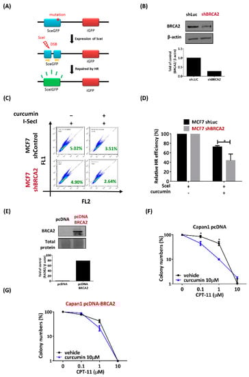 Curcumin decreased the sensitivity to CPT-11 in Capan1 cells that overexpress exogenous BRCA2. (A) The scheme illustrates the consequences of I-SceI-induced DSBs in DR-GFP. pSceI-GFP is a truncated GFP coding region that contains an I-SceI cutting site (blue box). The cleavage of the I-SceI cutting site can be repaired by homologous combination with a downstream GFP donor (red box) and results in GFP-positive cells (green box). (B) Immunoblot analysis of BRCA2 was performed to confirm knockdown. Bottom: quantification of the immunoblotting result. (C) Curcumin decreased HR in the MCF7-shBRCA2 cell line. MCF7-shRNA cells were cotransfected with I-SceI and DR-GFP plus with or without 20 µM curcumin. Forty-eight hours later, the cells were analyzed by flow cytometry to determine the percentage of GFP-positive cells. (D) The bar graph shows the mean percentage of GFP-positive cells. All values are moralized to cells that were transfected with control shRNA or shBRCA2 without curcumin treatment. (E) BRCA2-deficient Capan1 cells were transfected with pcDNA or pcDNA-BRCA2 plasmid. Cell samples were taken and processed for immunoblot analysis using a BRCA2 antibody. Bottom: quantification of the immunoblotting result. (F,G) Quantification of colony numbers from the clonogenic assay (data not shown). After transfection with the pcDNA or pcDNA-BRCA2 plasmid, Capan1 cells were seeded in six-well plates and then grown in media containing CPT-11 alone or combined with curcumin for 10-14 days. The detailed procedures are described in the Materials and Methods section. Asterisks (*) indicate significant differences between CPT-11 and combined CPT-11 and curcumin cells (* p < 0.05).