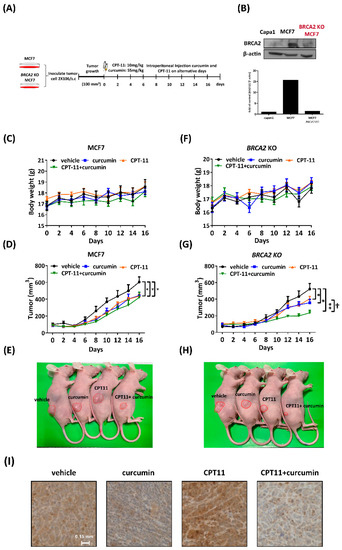 Curcumin sensitized BRCA2 KO MCF7 cells to chemotherapy in vivo. (A) Experimental procedure for subcutaneous implantation of MCF7 or BRCA2 KO MCF7 cells into the right flank of nude mice. The mice were then treated with vehicle, CPT-11 (i.p., 10 mg/kg), curcumin (i.p., 55 mg/kg), or their combination every other day for 16 days (n = 5). Tumor growth was monitored every 2 days, and the volume was calculated with the formula: volume = (width)2 × length/2. (B) BRCA2 expression levels were evaluated by Western blot using anti-BRCA2 and anti-actin antibodies. Bottom: quantification of the immunoblotting result. (C) The body weight of the MCF7 xenograft model was recorded every 2 days. (D) The tumor growth and volume of the MCF7 xenograft model were recorded every 2 days, and (E) representative images of the MCF7 tumor from each group are shown. Asterisks (*) indicate significant differences between the vehicle and other groups (* p < 0.05). (F) The body weight of the BRCA2 KO MCF7 xenograft model was recorded every 2 days. (G) The tumor growth and volume of the BRCA2 KO MCF7 xenograft model were recorded every 2 days. (H) Representative images of BRCA2 KO MCF7 tumors from each group. Asterisks (*) indicate significant differences between the vehicle and other groups (* p < 0.05, ** p < 0.01). (†) indicates significant differences between the CPT-11 and combined groups († p < 0.05). (I) Immunohistochemistry (IHC) for RAD52 in the xenograft mouse model of BRCA2 KO MCF7 tumors.