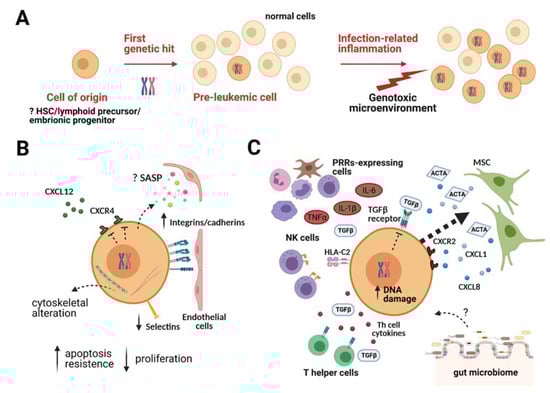 - Beneforti, L.; Dander, E.; Bresolin, S.; Bueno, C.; Acunzo, D.; Bertagna, M.; Ford, A.; Gentner, B.; Kronnie, G.T.; Vergani, P.; et al. Pro-inflammatory cytokines favor the emergence of ETV6-RUNX1-positive pre-leukemic cells in a model of mesenchymal niche. Br. J. Haematol. 2020, 190, 262–273. [Google Scholar] [CrossRef] [PubMed]