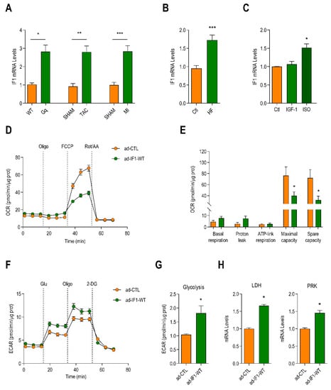Expression of ATPase inhibitory factor-1 (IF1) is increased in heart failure, decreases mitochondrial respiratory capacity, and promotes glycolysis in cardiomyocytes. (A) IF1 mRNA levels in mice with heart failure induced by cardiomyocyte autonomous expression of Gαq and wild-type (WT) littermate controls (n = 4), and mice with heart failure induced by transverse aortic constriction (TAC) (n = 6) or myocardial infarction (MI) (n = 6) surgeries and sham-operated controls (SHAM). (B) mRNA expression of IF1 in cardiac lysates from patients with end-stage heart failure and normal control hearts (n = 11). (C) IF1 mRNA expression in neonatal rat ventricular myocytes (NRVMs) treated with insulin-like growth factor-1 (IGF-1, 10 nM), isoproterenol (ISO, 100 nM) or vehicle (Ctl) for 48 h (n = 4). (D) Neonatal rat ventricular myocytes (NRVMs) were infected with an adenoviral vector expressing human IF1 (ad-IF1-WT) or a control virus expressing green fluorescent protein (GFP) (ad-CTL) for 48 h. The line graph depicts changes in the oxygen consumption rate (OCR) of NRVMs after serial treatments with oligomycin (oligo), FCCP, and rot + AA assessed with the Seahorse system. The graph represents five independent experiments. (E) Bar graph depicting differences in basal respiration, ATP-linked respiration, maximal respiration, and mitochondrial spare capacity (n = 5). Data are presented as mean ± SEM. * p < 0.05 and ** p < 0.01 by parametric test t-test. (F) Changes in extracellular acidification rate (ECAR) in cells infected with ad-IF1-WT or ad-CTL after serial additions of glucose, oligomycin, and 2-deoxyglucose (2-DG, n = 4). (G) Bar graph depicting differences in glycolysis in NRVMs treated as in F (n = 4). (H) mRNA levels of lactate dehydrogenase (LDH) and pyruvate kinase (PRK) assayed with RT-qPCR (n = 4). Data are presented as mean ± SEM. * p < 0.05, ** p < 0.01, and *** p < 0.001 vs. SHAM/Ctrl/ad-CTL using the Mann–Whitney U test or T-test where appropriate.