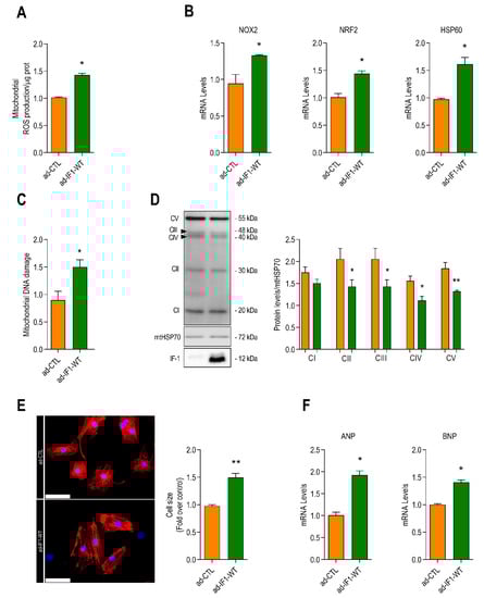 IF1 overexpression promotes mitochondrial reactive oxygen species (ROS) production and cardiomyocyte hypertrophy. NRVMs were infected with an adenoviral vector expressing the human IF1 (ad-IF1-WT) or a control virus (ad-CTL) for 48 h. All bar graphs depict the results of at least three independent experiments. (A) Basal mitochondrial ROS emissions detected with the mitochondrial ROS sensor MitoSOX® (n = 4). (B) mRNA expression of the mitochondrial ROS-sensitive genes NADPH oxidase 2 (NOX2), nuclear receptor factor-2 (NRF2), and heat shock protein-60 (HSP60) (n = 4). (C) Semi-log-run polymerase chain reaction was performed using specific primers for mitochondrial DNA fragments in the mitochondrial D-Loop region to determine oxidative damage to mitochondrial DNA (n = 4). (D) Changes in the protein levels of mitochondrial respiratory chain complexes in cells infected with ad-IF1-WT and ad-CTL detected by Western blot. Different complex levels were normalized for mitochondrial heat shock protein-70 (mtHSP70) levels (n = 4). (E) Typical example of immunofluorescent staining of NRVMs cultured with a fluorescent-labeled anti-α-actinin (red, left panel) and (right panel) average cardiomyocyte surface area of α-actinin-positive cells (n = 5). (F) mRNA expression of atrial natriuretic peptide (ANP) and B-type natriuretic peptide (BNP). Data are presented as mean ± SEM. * p < 0.05 and ** p < 0.01 vs. ad-CTL by nonparametric Mann–Whitney U test using the Mann–Whitney U test or T-test where appropriate.