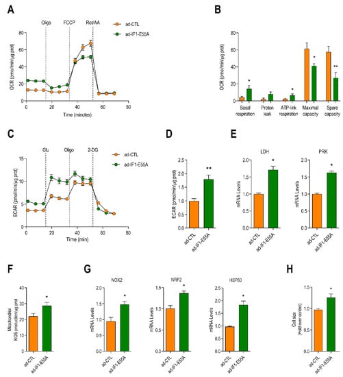 Despite its inability to bind to ATP synthase, ad-IF1-E55A induced similar reductions in maximal mitochondrial respiration and mitochondrial spare capacity as ad-WT-IF1 (Figure 3A,B). Infection with ad-IF1-E55A also resulted in a marked increase in glycolysis (Figure 3C,D) as well as increased expression of LDH and PRK (Figure 3E). Mitochondrial ROS emissions were also increased after infection with ad-IF1-E55A (Figure 3F), as were the expression levels of NOX2, NRF2, and HSP60 (Figure 3G). Moreover, downregulation of the respiratory chain complexes II, IV, and V was also observed with ad-IF1-E55A (Figure S4C).