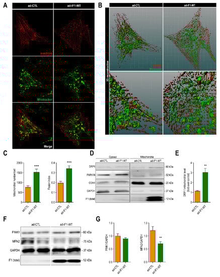 IF1 induces mitochondrial fission by promoting dynamin-related protein 1 (DRP1) translocation. NRVMs were infected with adenovirus ad-IF1-WT or empty vector (ad-CTL) for 48 h. (A) Representative Z-stack image of neonatal rat ventricular myocyte stained with MitoTracker® Deep Red (green) and anti-α-actinin (red) using confocal microscopy. (B) 3D imaging reconstruction was employed for mitochondrial network analysis (30–36 Z-stacks slices were recorded per cell). Representative example of confocal stack acquisition followed by 3D reconstruction after image deconvolution of cells stained as in A. (C) Bar graphs depicting differences in mitochondrial number per cell (left bar graph) and fission index (right bar graph). Both ratios were calculated from 3D multislice reconstruction values. Fission index estimation was measured using the number of mitochondrial normalized for mitochondrial volume per cell (ad-CTL, n = 17 cells and ad-IF1-WT, n = 18 cells). (D) Dynamin-related protein 1 (DRP1), cytochrome c oxidase subunit 4 (COXIV), and glyceraldehyde 3-phosphate dehydrogenase (GAPDH) protein level in mitochondrial and cytosolic fractions of NRVMs infected with IF1-WT and ad-CTL and (left panel). (E) DRP1 protein levels normalized for COXIV in the mitochondrial fraction (n = 4). (F) PTEN-induced kinase 1 (PINK1) and mitofusin-2 (MFN2) protein levels normalized for GAPDH. (G) Bar graphs depict densitometric analysis from protein levels normalized using immunoblot. Data are presented as mean ± SEM. ** p < 0.01, and *** p < 0.001 vs. ad-CTL using the Mann–Whitney U test or T-test where appropriate.