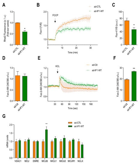 Excessive mitochondrial fission reduces the mitochondrial capacity to store Ca2+ and contributes to mitochondrial dysfunction in heart failure [,,]. We, therefore, sought to determine whether IF1 affects mitochondrial and cellular Ca2+ homeostasis. Infection with ad-IF1-WT resulted in a significant reduction in mitochondrial Ca2+ concentrations detected with the mitochondrial Ca2+ indicator Rhod2-AM (Figure 5A). Similarly, FCCP-induced mitochondrial Ca2+ release was also significantly reduced by IF1 (Figure 5B,C).