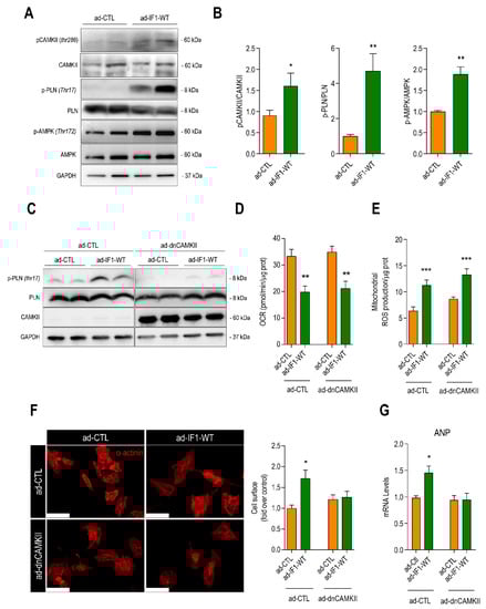 IF1-induced cardiomyocyte hypertrophy is dependent upon CaMKIIδ activation. NRVMs were infected with adenovirus ad-IF1-WT and ad-CTL for 48 h. (A) Representative immunoblot depicting phosphorylation of CAMKII (threonine 286) and CaMKII-dependent phosphorylation of phospholamban (p-PLN, thr17) and adenosine monophosphate-activated protein kinase (p-AMPK, thr172), normalized for the total protein (left panel). (B) Bar graphs depicting differences in phosphorylation between experimental groups (n = 7). (C) NRVMs were co-infected with adenovirus expressing IF1-WT or ad-CTL in the presence or absence of a catalytically dead mutant of CAMKIIδC (ad-dnCAMKII) for 48 h. Representative immunoblots from whole-cell lysate using an antibody specific for p-PLN (thr17), total PLN, CAMKII (PAN), and GAPDH (n = 4). (D) Maximal mitochondria respiration through oxygen consumption rate (OCR) recorded using Mito Stress Test Seahorse assay. (E) Bar graph depicting basal mitochondrial ROS levels assayed with MitoSOX® (n = 4). (F) Typical example of immunofluorescent staining of cultured NRVMs with a fluorescent-labeled anti-α-actinin (red, left panel) and (right panel) average cardiomyocyte surface area of α-actinin-positive cells (scale bar represents 50 µm, n = 4). (G) ANP mRNA level normalized for 36B4 (n = 4). * Data are presented as mean ± SEM. * p < 0.05, ** p < 0.01, and *** p < 0.001 vs. ad-CTL using the Mann–Whitney U test (A,B) or the Kruskal–Wallis test (D–G).