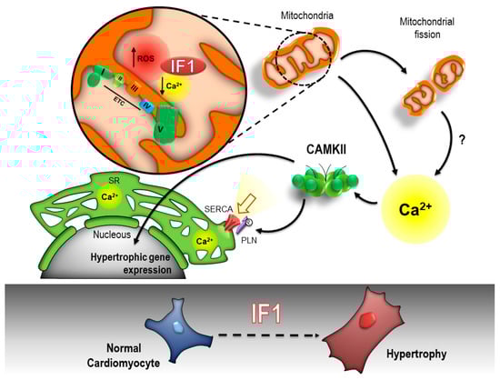 The following are available online at https://www.mdpi.com/article/10.3390/ijms22094427/s1: Figure S1: IF1 gene expression during embryonic development and heart failure. Figure S2: Effect of IF1 on mitochondrial membrane potential, ATP levels and cell death after respiratory collapse. Figure S3: Effect of IF1 expression on phenylephrine-induced cardiomyocyte hypertrophy. Figure S4: An IF-1 mutant incapable of binding to ATP-synthase still downregulates respiratory chain complexes and stimulates natriuretic peptides. Figure S5: IF1 overexpression does not affect mitochondrial content. Figure S6: Figure S6. Effects of IF-1 CaMKII-dependent and PKA-dependent phosphorylation of Phospholambam. Figure S7: IF-1 mutant sufficient to reduce mitochondrial calcium and activate CAMKII signaling. Table S1: Antibodies used for immunoblotting. Table S2: Primers sequences list used for RT-qPCR.