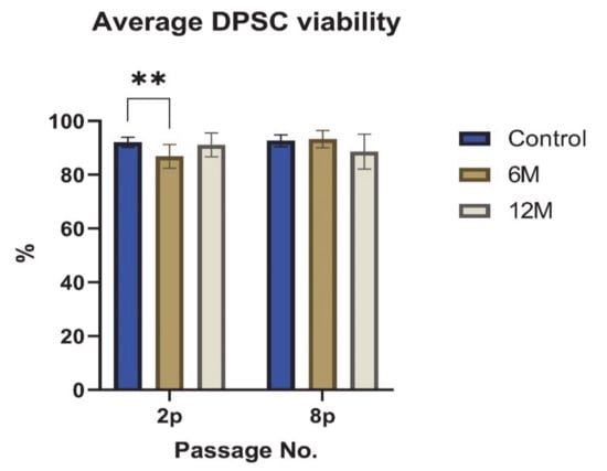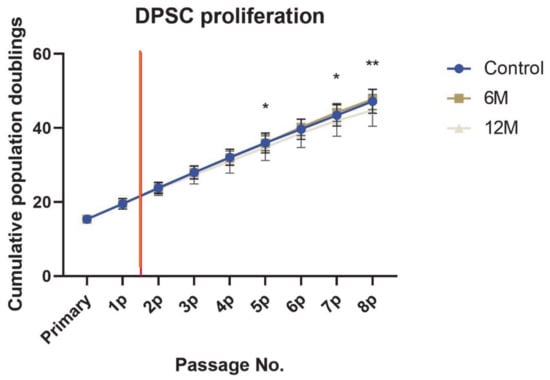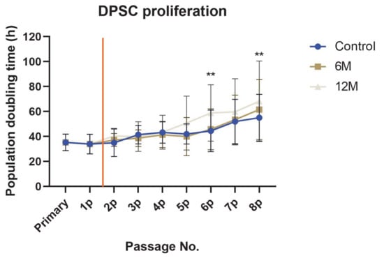 - Pilbauerova, N.; Soukup, T.; Suchankova Kleplova, T.; Schmidt, J.; Suchanek, J. The Effect of Cultivation Passaging on the Relative Telomere Length and Proliferation Capacity of Dental Pulp Stem Cells. Biomolecules 2021, 11, 464. [Google Scholar] [CrossRef]