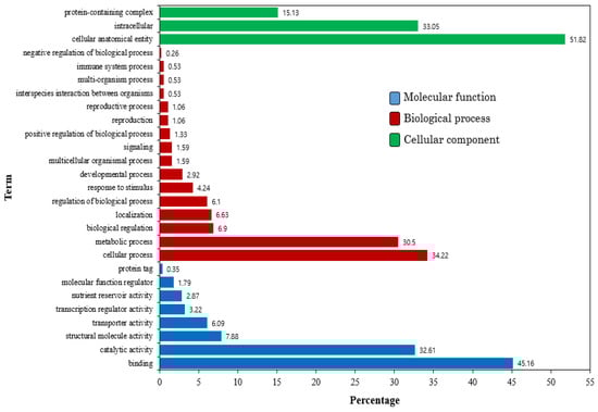 The method used by Kim [] was implemented to detect DEGs between control and treatments after applying two filtering processes. Genes were filtered based on twofold change and p-value (p < 0.05), and DAVID (http://david.abcc.ncifcrf.gov/ accessed on 21 November 2020) was used to obtain a comprehensive set of functional annotations (Figure 6).