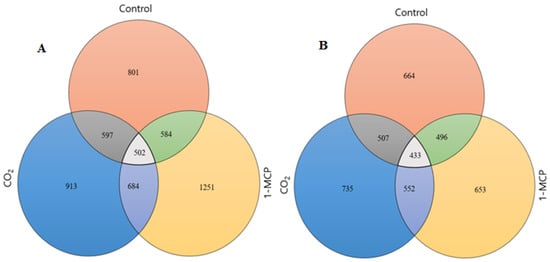 Numbers of commonly and exclusively expressed (A) upregulated and (B) downregulated genes based on twofold change and p-value < 0.05 during the comparison of control (control vs. CS), 1-MCP (control vs. 1-MCP+CS), and CO2 (control vs. CO2+CS) ‘Madoka’ peach fruit after 12 days storage at 0 °C.