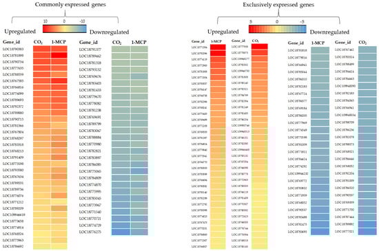 Differentially expressed genes (DEGs) were compared on the basis of twofold change and p value < 0.05 during the comparison of control to CS, 1-MCP+CS, and CO2+CS. Venn diagrams summarize the number of overlapping differentially expressed genes in the comparison of CS, 1-MCP+CS, and CO2+CS vs. control (Figure 2). A total of 1465, 1904, and 1648 unigenes were differentially expressed during the comparison of CS, 1-MCP+CS, and CO2+CS, vs. control ‘Madoka’ peach fruit, respectively. From the differentially expressed unigenes, 801 (55%), 1251 (66%), and 913 (55%) were upregulated, and 664 (45%), 653 (34%), and 735 (45%) were downregulated in the CS, 1-MCP+CS, and CO2+CS fruit, respectively. More unigenes were expressed due to the combined effects of CS and pre-storage treatment of ‘Madoka’ peach fruit with 1-MCP and CO2 as compared to the CS (Figure 2). Commonly and exclusively expressed and identified DEGs in the comparison of CS vs. CO2+CS and 1-MCP+CS ‘Madoka’ peach fruit were summarized by heat map (Figure 3). A long list of identified, commonly and exclusively expressed DEGs that might attract researchers for more detailed work are reported in this study (Tables S1–S3). Attempts were also made to briefly discuss and relate some of the identified genes into different ripening-related parameters.