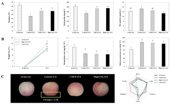 Firmness, total pectin, PG activity (A); weight loss, respiration rate, ethylene production rate (B); and fruit appearance, CI index, and sensory qualities (C) of ‘Madoka’ peach fruit at harvest and after 12 days storage at 0 °C with pre-storage 1-MCP and high CO2 treatments or without treatment (control). Data for firmness, CI index, and sensory quality are presented as a mean of 10 biological replicates ± standard errors. Total pectin, PG activity, weight loss, respiration rate, and ethylene production rate are presented as a mean of three replicates ± standard errors. Different letters on the bars indicate significant difference between treatments with Duncan’s multiple range test at p ≤ 0.05.