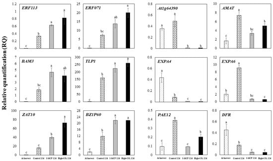 Transcript accumulation of the selected DEGs of ‘Madoka’ peach fruit by qRT-PCR for the comparison of fruit at harvest and after 12 days storage at 0 °C with pre-storage 1-MCP and high-CO2 treatments or without treatment (control). Vertical bars represent standard errors of the means (n = 3). Different letters on the bars indicate significant difference between treatments with Duncan’s multiple range test at p ≤ 0.05.