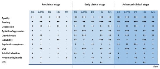 Psychiatric symptoms during different stages of neurodegenerative and neuroinflammatory diseases. AD = Alzheimer’s disease; bvFTD = Behavioral variant of fronto-temporal dementia; HD = Huntington’s disease; MS = Multiple sclerosis; PD = Parkinson’s disease; ICD = Impulse control disturbances; OCS = Obsessive-compulsive symptoms. - = Not reported; + = Prevalence <25%; ++ = Prevalence 25–50%; +++ = Prevalence >50%.